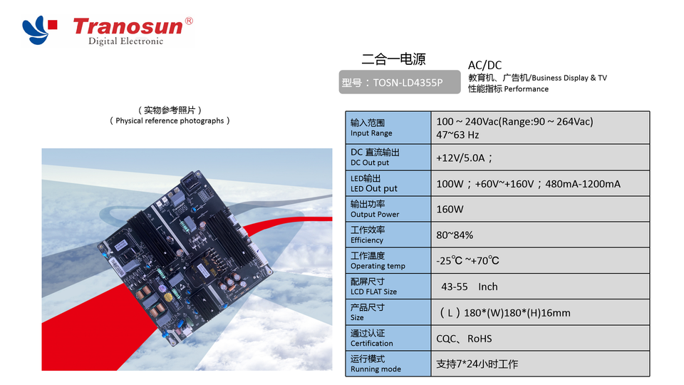 TOSN-LD4355P แหล่งจ่ายไฟสลับ160วัตต์สำหรับทีวีจอธุรกิจสำหรับทีวีขนาด43-55นิ้ว110โวลต์/200โวลต์แรงดันไฟฟ้าขาเข้า5A กระแสไฟขาออกที่ดี