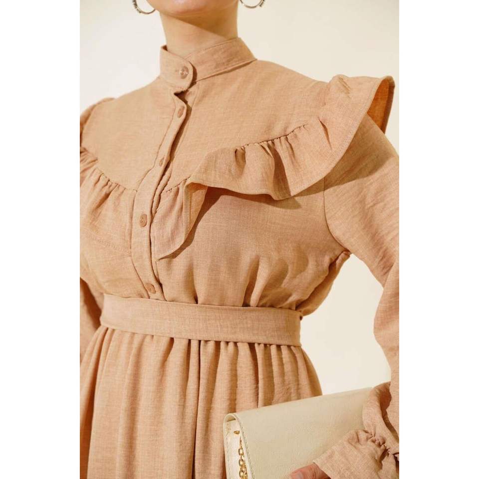 TR ชุดเดรสผ้าลินินลาเต้เปิดไหล่แต่งระบาย XL-2XL ลายปกติ