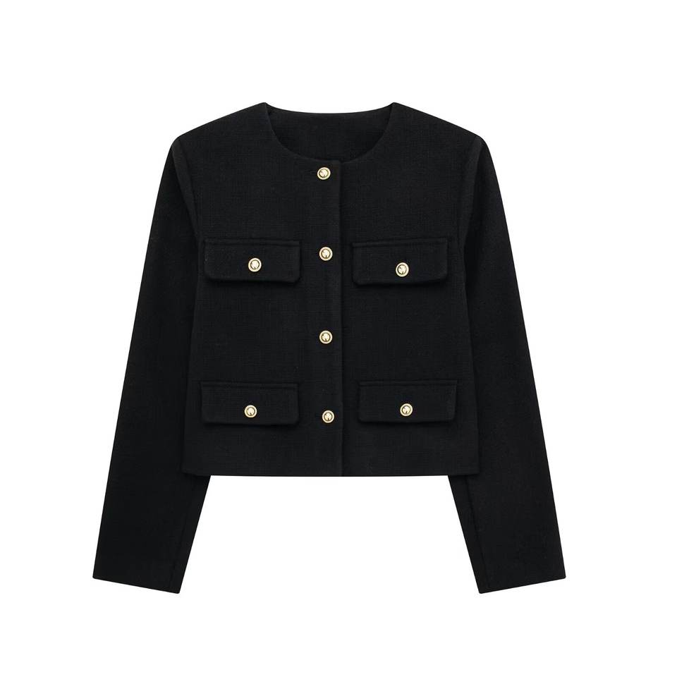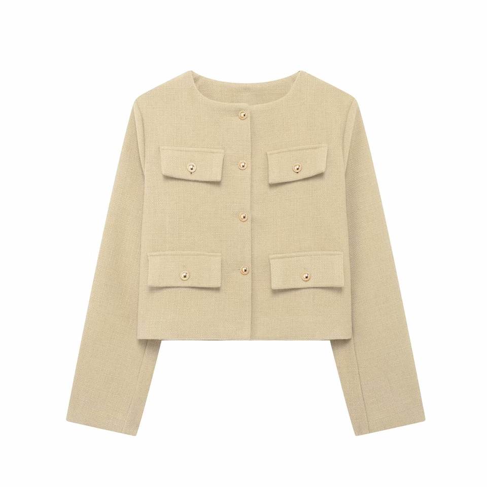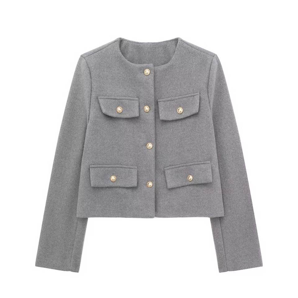 เสื้อโค้ทผู้หญิง TRAFZA แขนยาว ดีไซน์หรูหรา กระดุมแถวเดียว ผ้ามีเท็กซ์เจอร์ คอทรงโอ แต่งกระเป๋าแบบพับ แจ็คเก็ตสั้นสำหรับฤดูใบไม้ร่วง