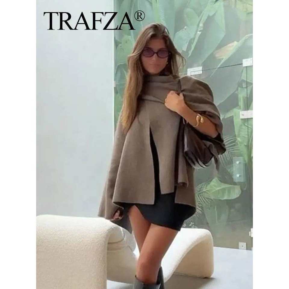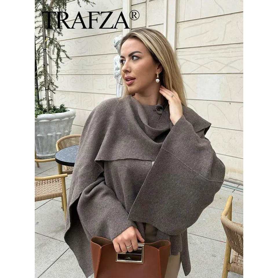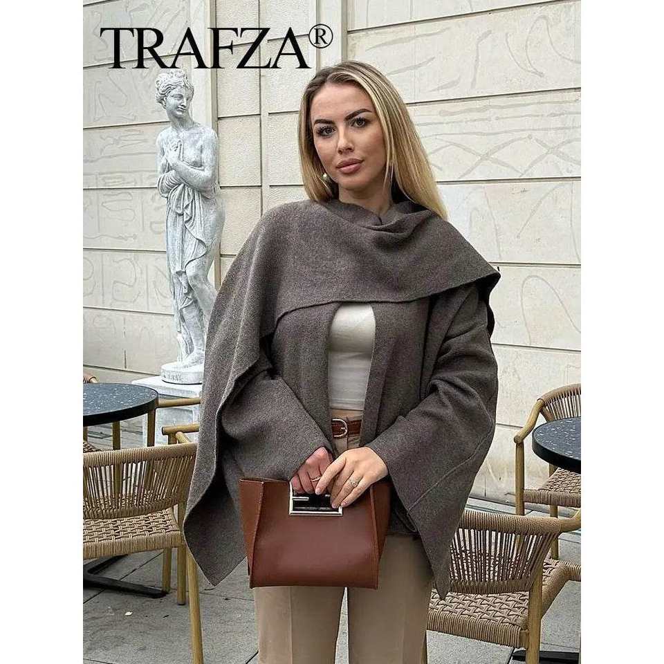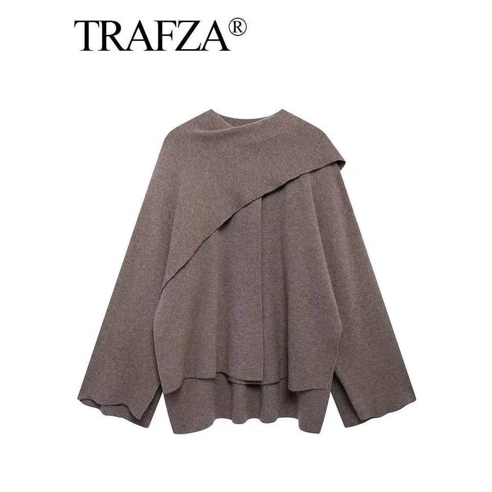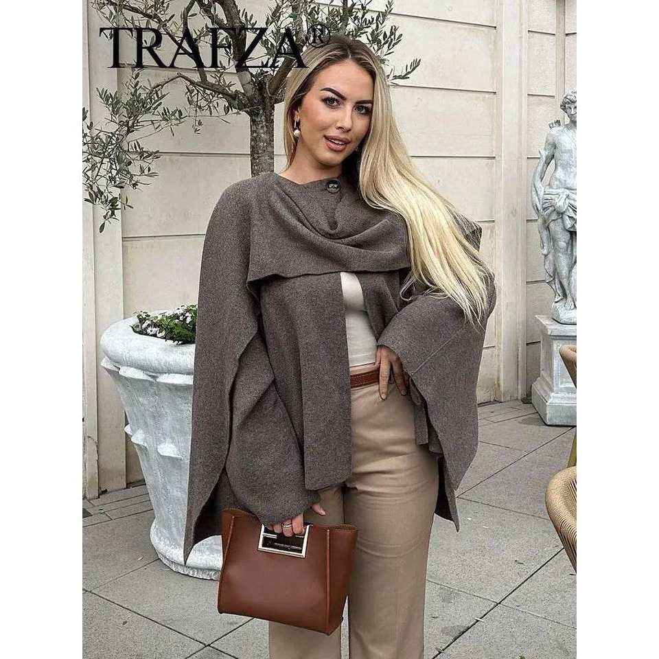 TRAFZA Women's Autumn Loose Asymmetric Scarf Knit Jacket with Solid Long Sleeves Single Button Side Slit Cardigan Lady Outerwear
