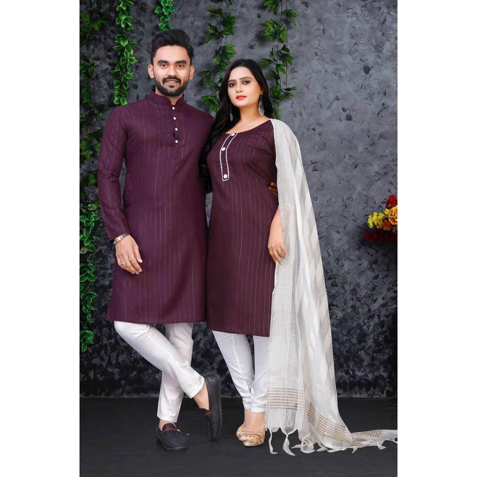 งานทอผ้าฝ้ายสลับสีแบบดั้งเดิม ลุคใหม่สำหรับคู่รัก ชุดเทศกาล พร้อมสวม สีไวน์