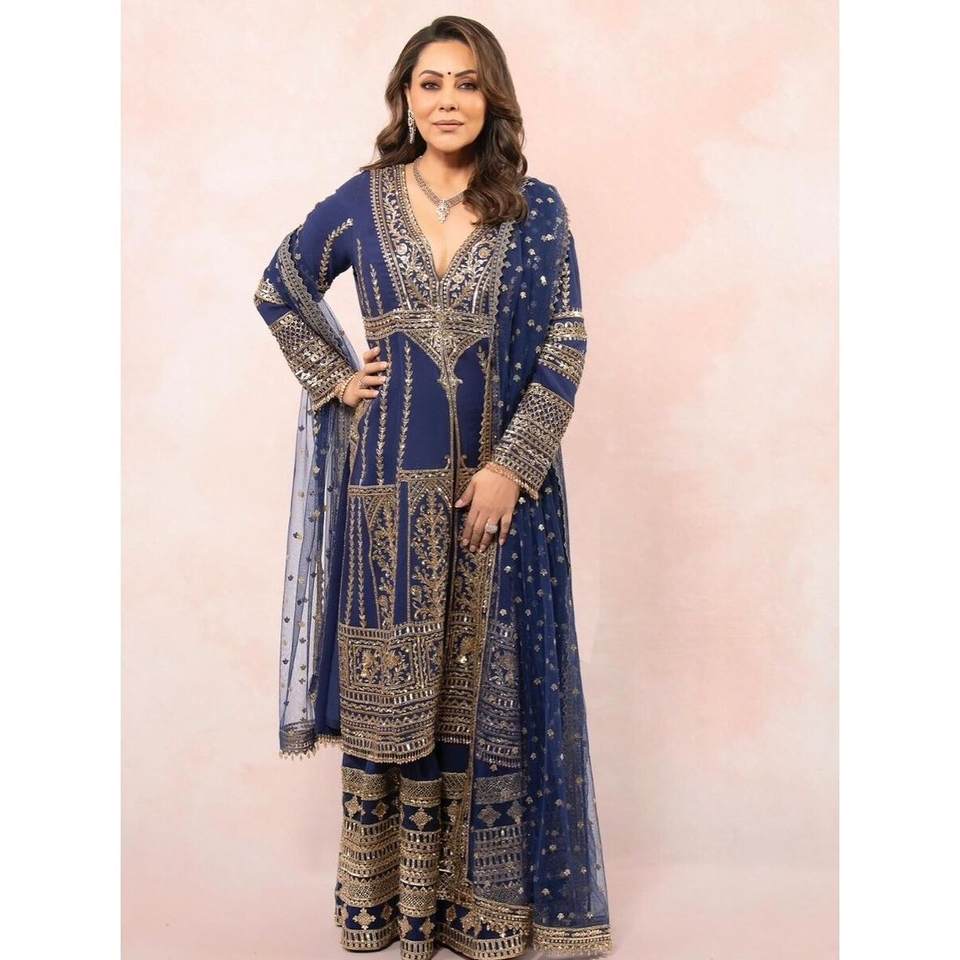 ชุดเสื้อท็อปปักลายจอร์เจตต์สุดฮิต พร้อมกางเกงชาราราและผ้าคลุมไหล่ สีน้ำเงินกรมท่า
