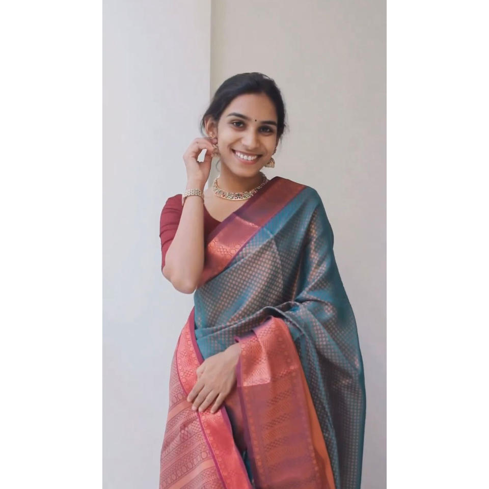 ผ้าส่าหรีผ้าไหมนุ่มสีฟ้า Banarasi