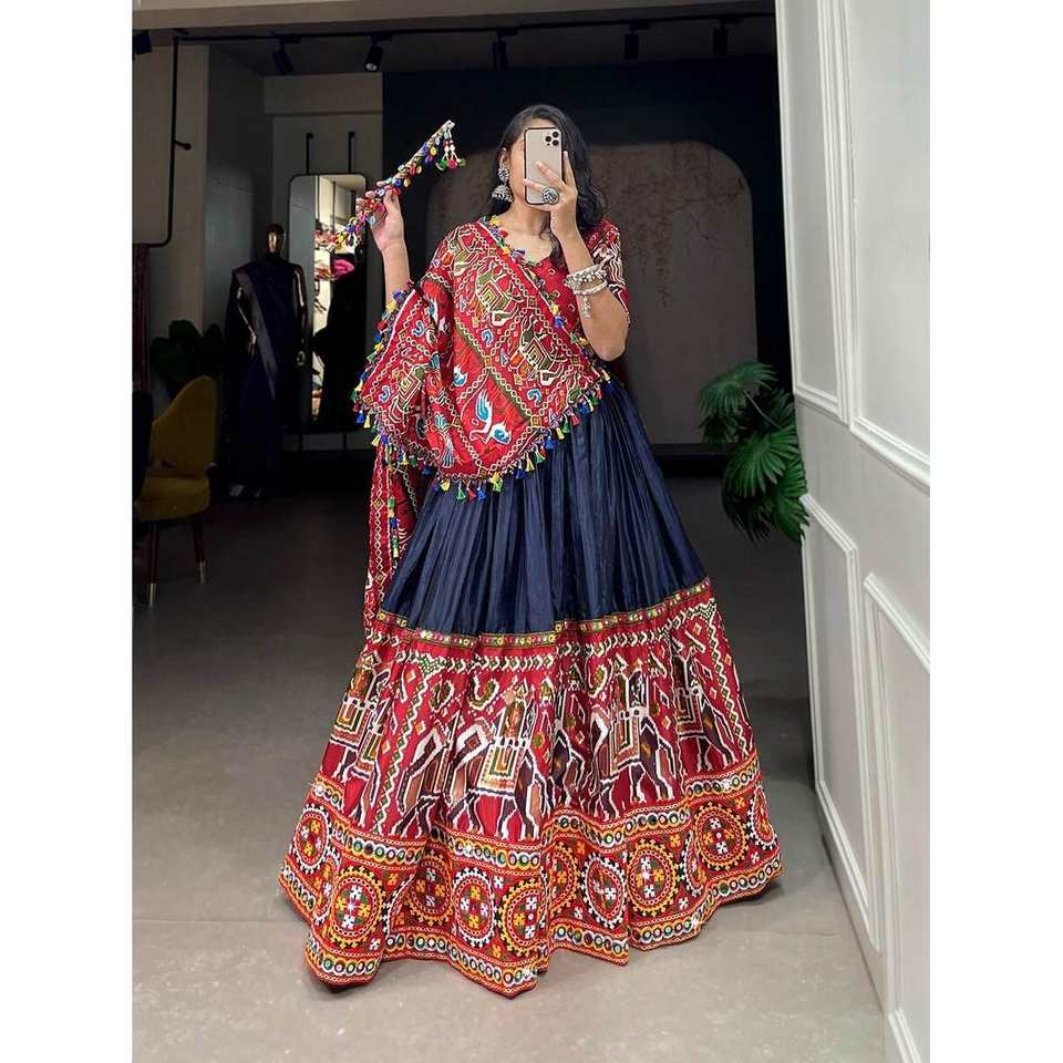 Lehenga choli ทำงานกระจกพิมพ์ลายดิจิทัลผ้าไหมเนยได้รับความนิยม