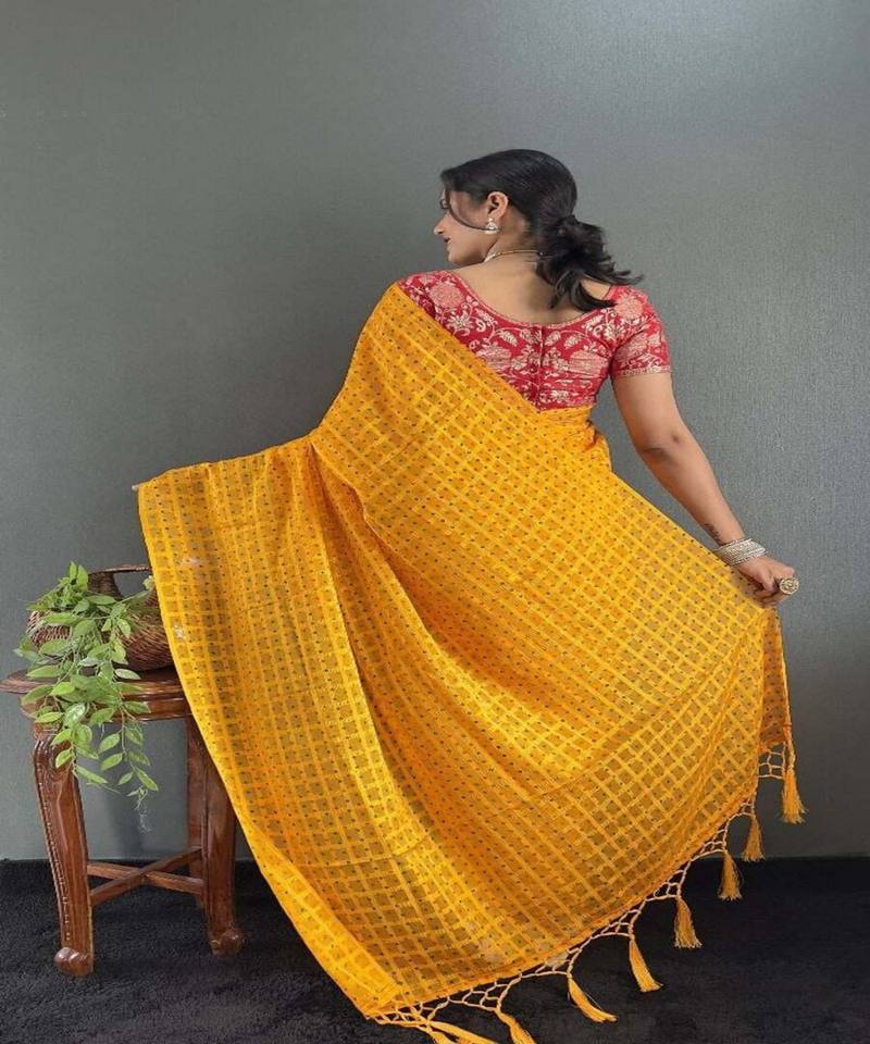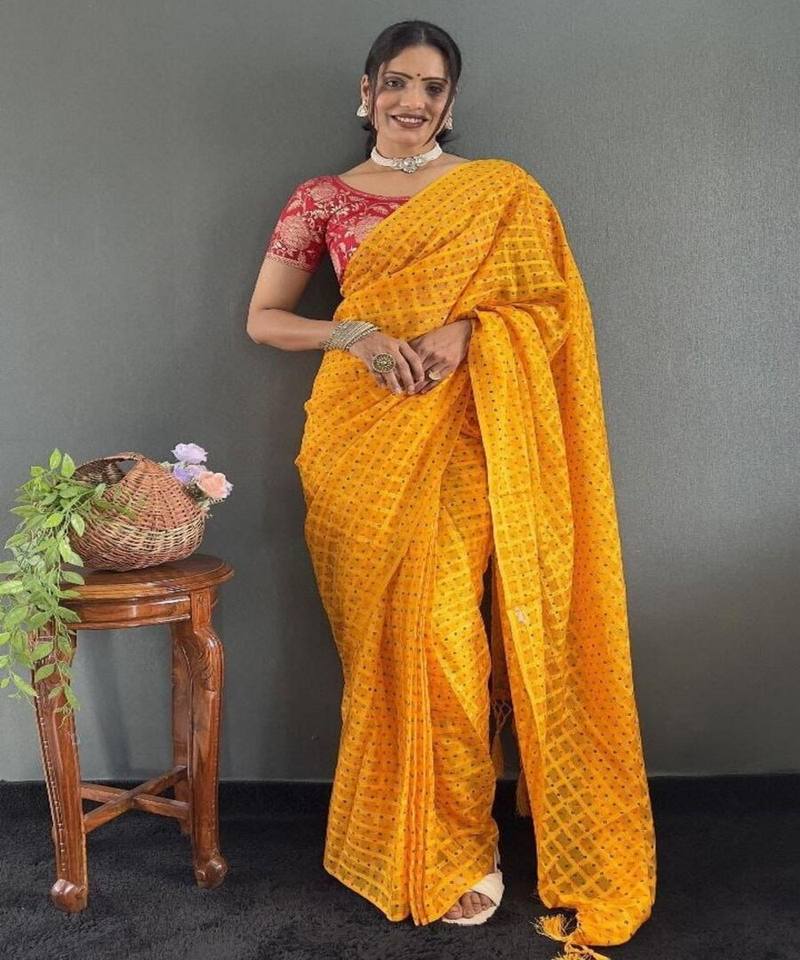 Khadi ชุดส่าหรีผ้าชีฟองพิมพ์ลายเสื้อแบบเรียบๆเสื้องานปาร์ตี้สีเหลือง