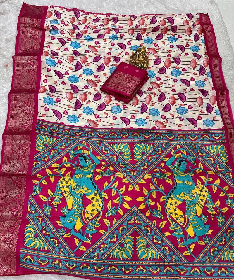 ชุดส่าหรีผ้าไหมลายโดลาผ้าแจ็คการ์ดสีขาวสำหรับใส่ไปงานแต่งงาน