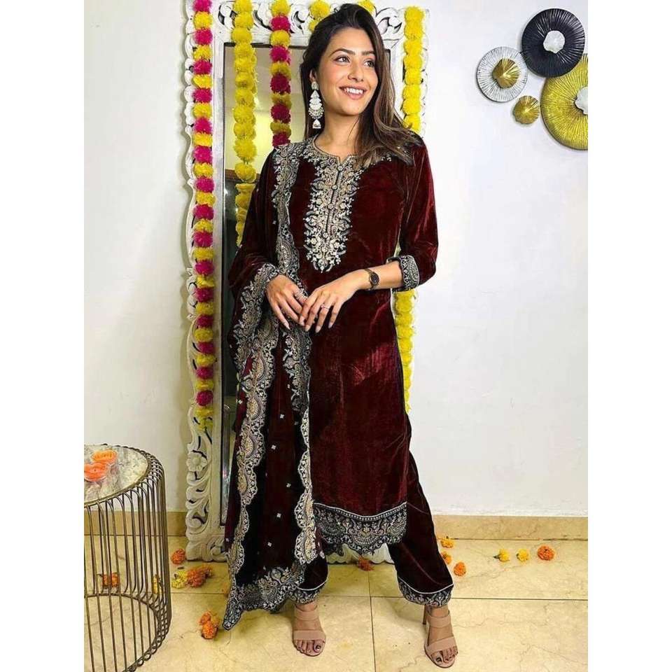 ผ้ากำมะหยี่ปักลาย zari เสื้อใส่ทำงานเป็นวังพร้อมสีน้ำตาลแดง