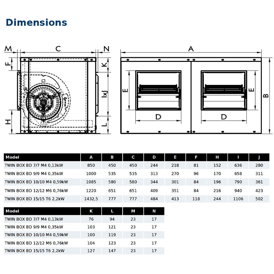 กล่องคู่10/10 0,21kW M6พัดลมตู้แรงเหวี่ยงคู่พร้อมใบพัดโพลีอะไมด์มอเตอร์คลาส F; ช่วงอัตราการไหลจาก1850