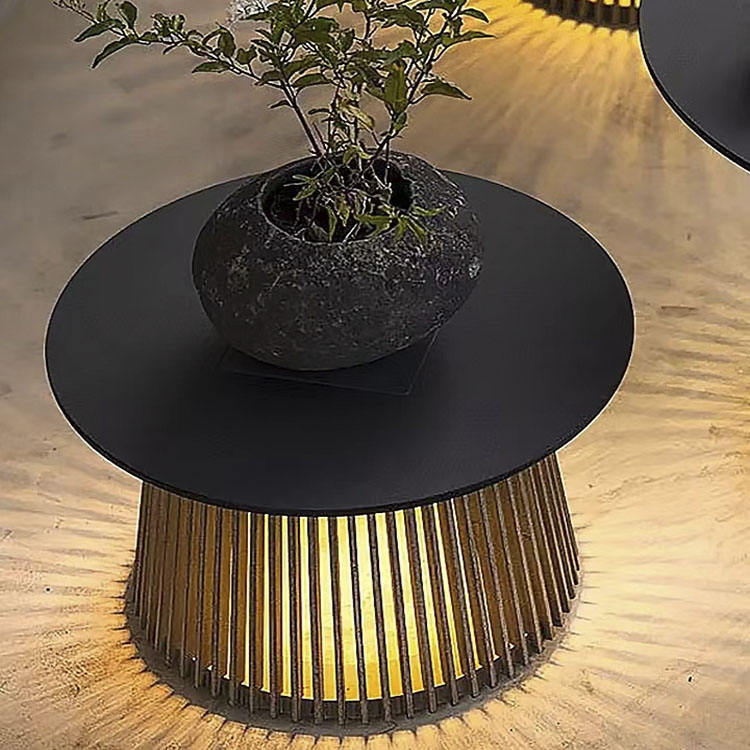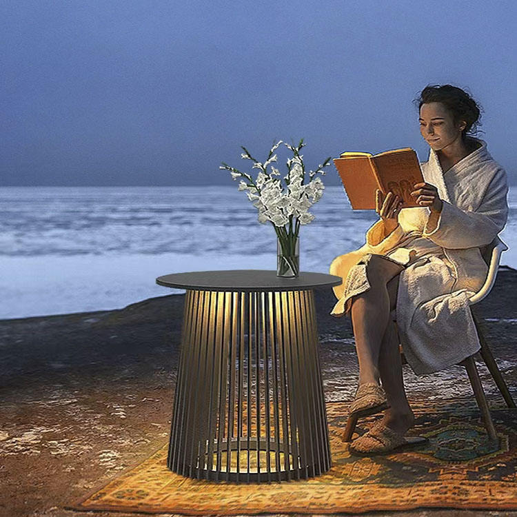 ไฟโต๊ะนั่งเล่นเฟอร์นิเจอร์ห้องรับประทานอาหารแบบกลมชุดโคมไฟโต๊ะกาแฟพร้อมไฟ LED พลังงานแสงอาทิตย์ไฟสวนเก้าอี้รับประทานอาหารกลางแจ้ง
