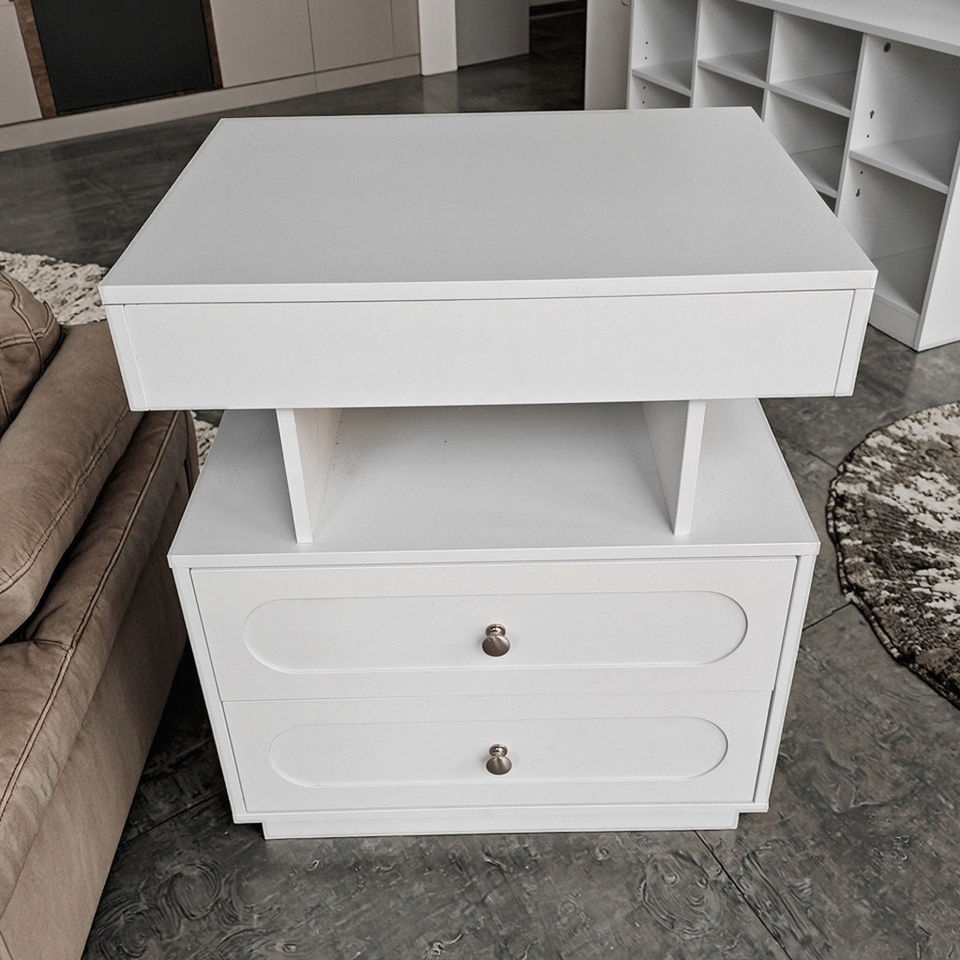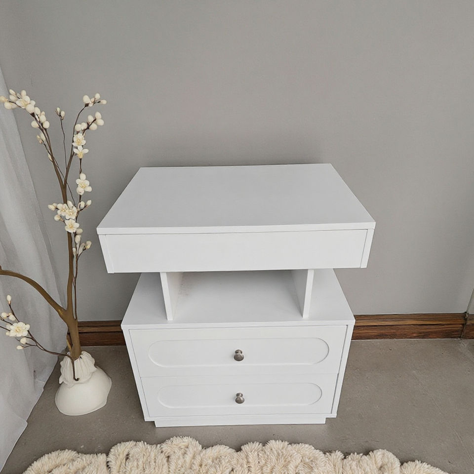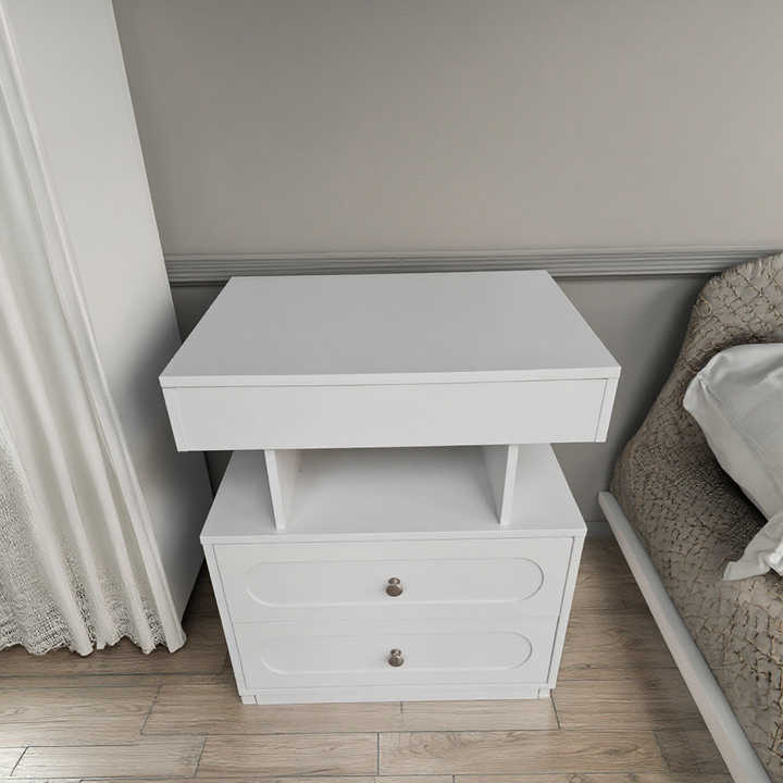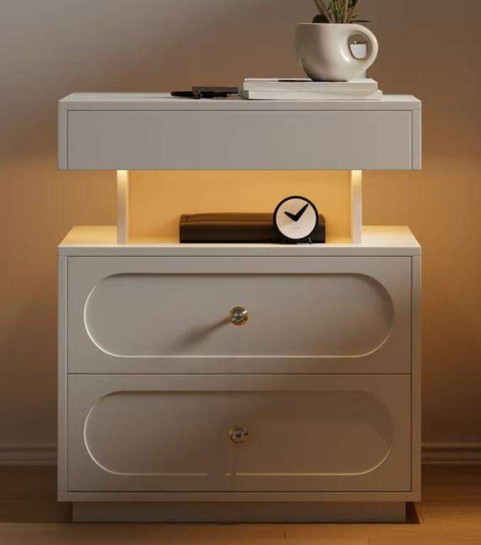 โต๊ะข้างเตียงไม้ MDF สีขาว โต๊ะข้างเตียงแบบลอยตัว 3 ลิ้นชัก พร้อมไฟ LED โต๊ะข้างเตียงอัจฉริยะสำหรับห้องนอน