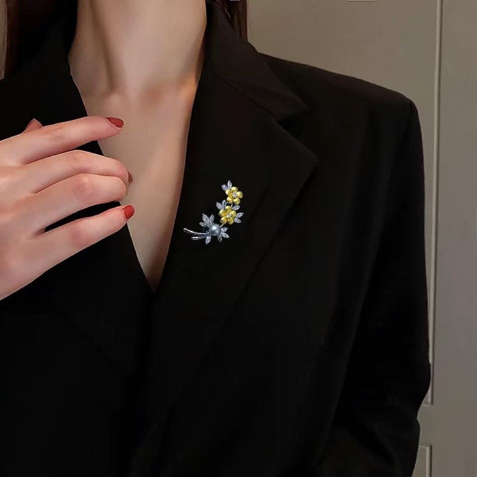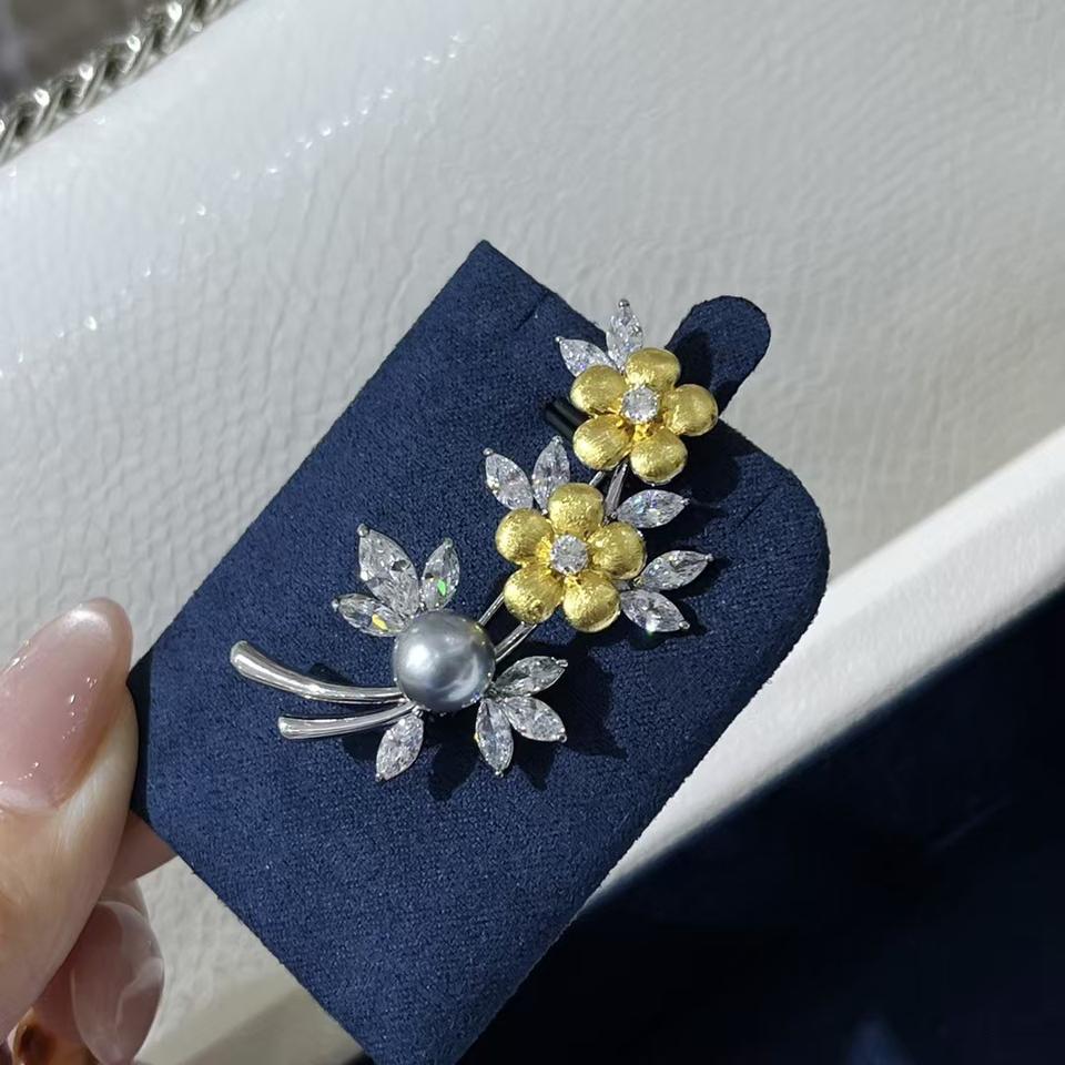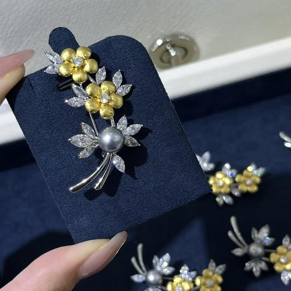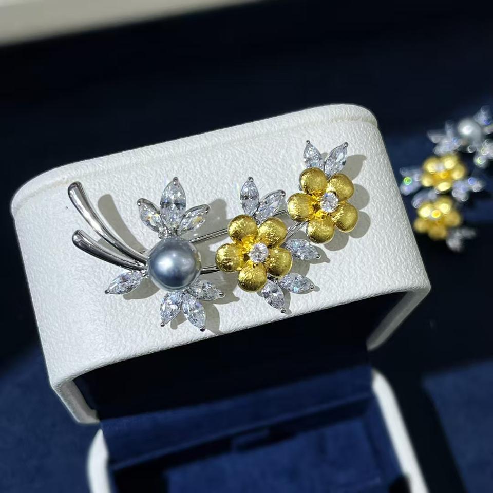 เข็มกลัดมุกน้ำทะเลทรงดอกไม้สีเทาแพลตตินัมประดับคริสตัลจากตาฮิติ ขายส่งและขายปลีก