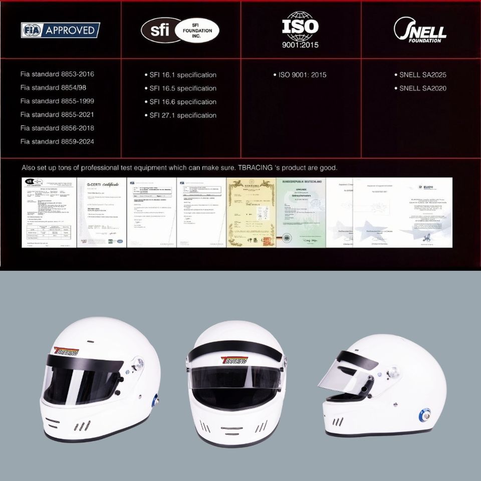 หมวกกันน็อคเต็มใบสำหรับแข่งรถ รุ่นใหม่จากไต้หวัน TBRACING ระดับมืออาชีพ รับผลิตแบบ OEM/ODM ปรับแต่งสีและโลโก้ได้ ได้รับการรับรองมาตรฐาน ISO 9001 ผ่านการรับรอง FIA/Snell