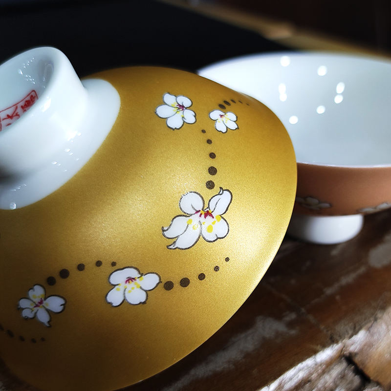 ชุดแก้วเซรามิกพอร์ซเลนลายดอกทัง ไต้หวัน ดีไซน์เคลือบมุกสีทอง ใช้กับไมโครเวฟและเครื่องล้างจานได้ บรรจุในกล่องของขวัญ