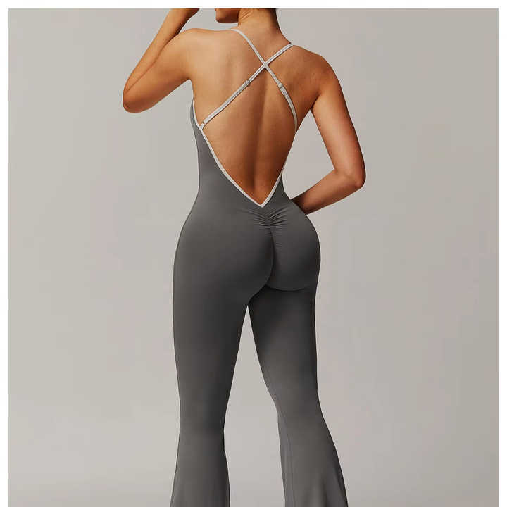 จั๊มสูทโยคะแบบชิ้นเดียวสำหรับสาวสูง กระชับสะโพก ทรงขาบาน รับสกรีนโลโก้ ชุดออกกำลังกาย