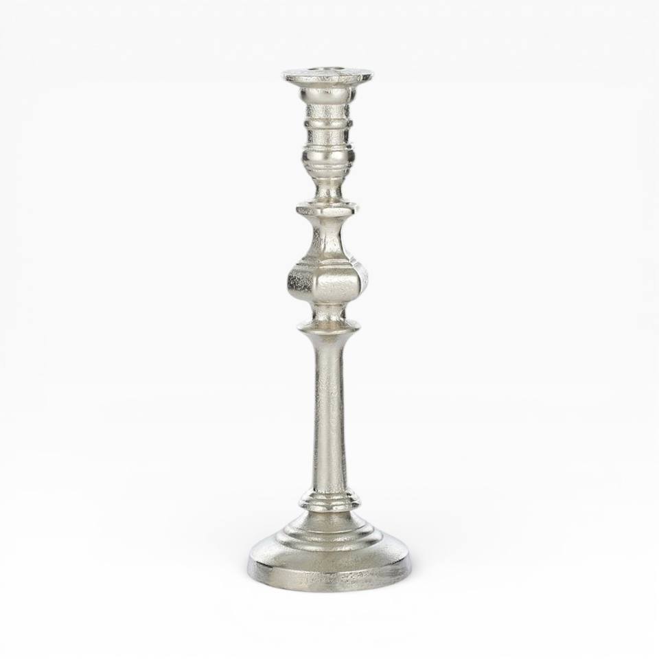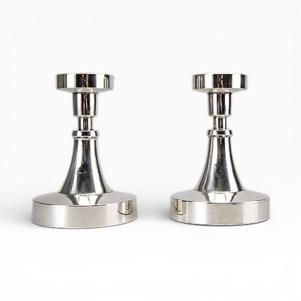 เชิงเทียนโลหะสีเงินขัดเงาทรงสูง คู่หนึ่ง พร้อมก้านเรียวและฐานกว้าง สำหรับตกแต่งสไตล์โมเดิร์น