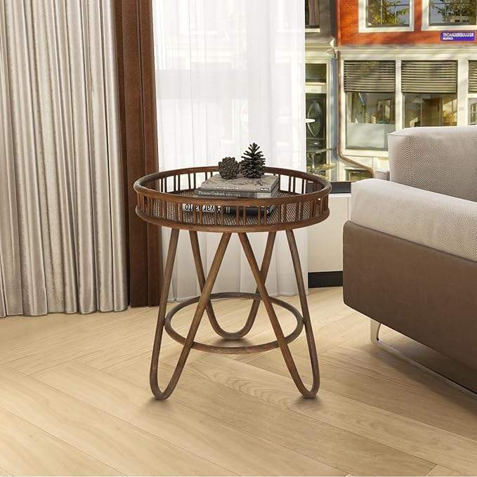 โต๊ะปลายสไตล์โบฮีเมียนทรงกลมสูงพร้อมถาดรองสานบนโต๊ะข้าง20X23มีกิ๊บติดผมขาสำหรับเฟอร์นิเจอร์ห้องนั่งเล่น