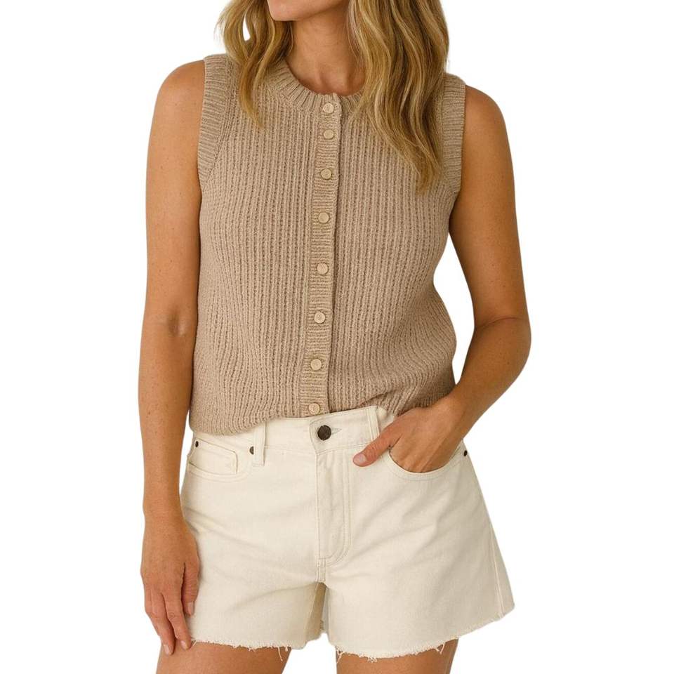 เสื้อกล้ามถักทรงพอดีตัวสำหรับผู้หญิง แต่งกระดุมสีแทน คอเต่า แขนกุด ชายเสื้อเปปลัม ผ้าถักลายริบ