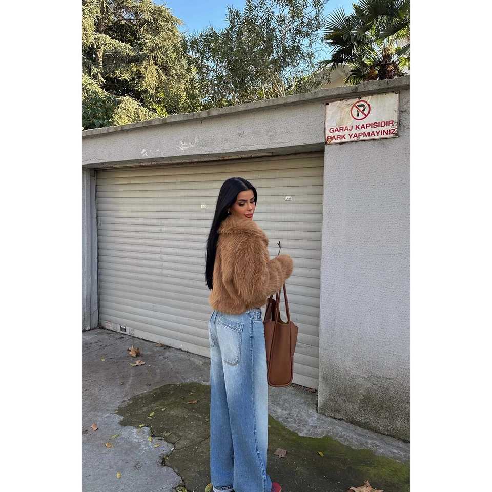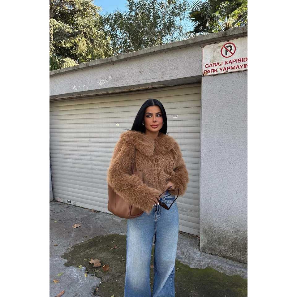 เสื้อแจ็คเก็ตขนสัตว์เทียมแบบสั้น Tan Fausta พร้อมเข็มขัดรัด ลายพิมพ์กระต่าย จิ้งจอก และมิงค์ ผ่านการเคลือบและทอในเนื้อผ้าแคชเมียร์
