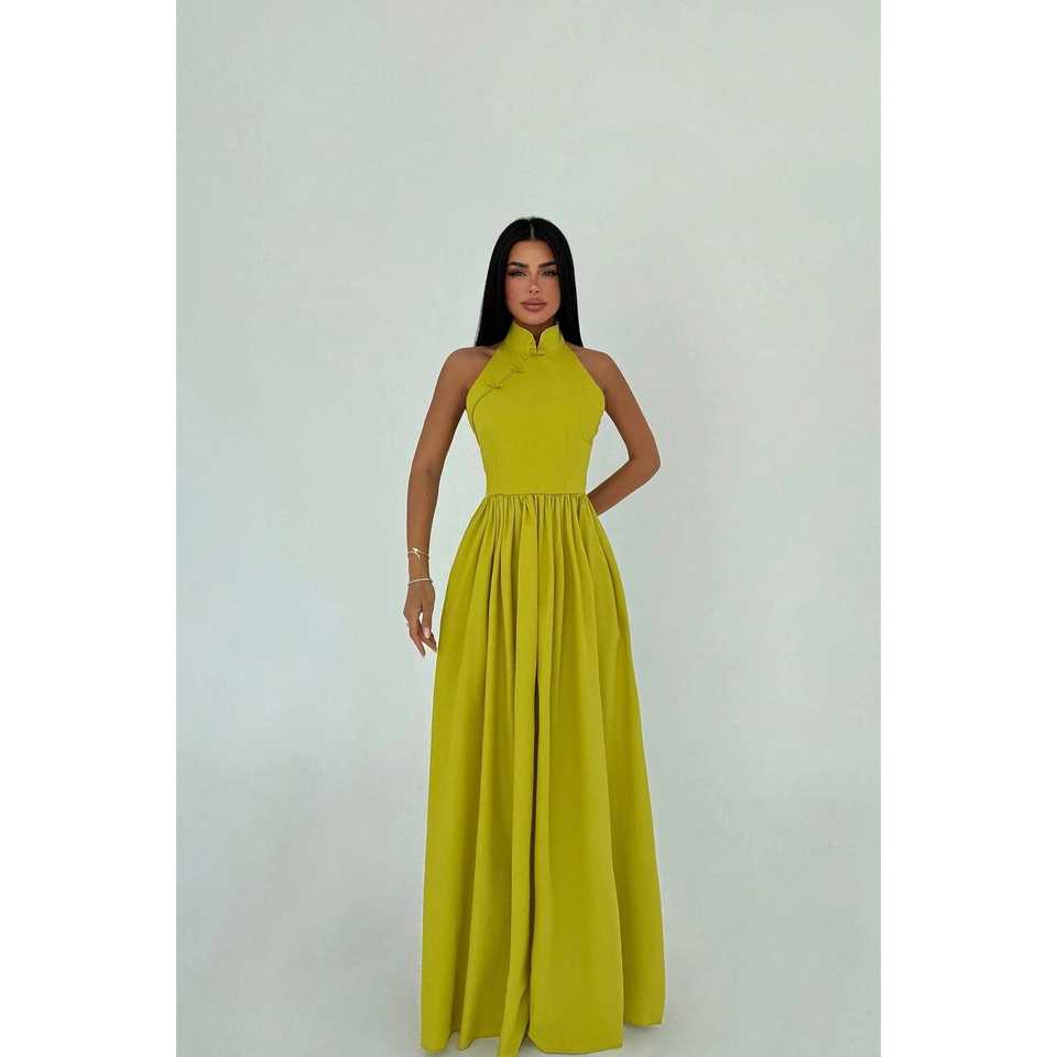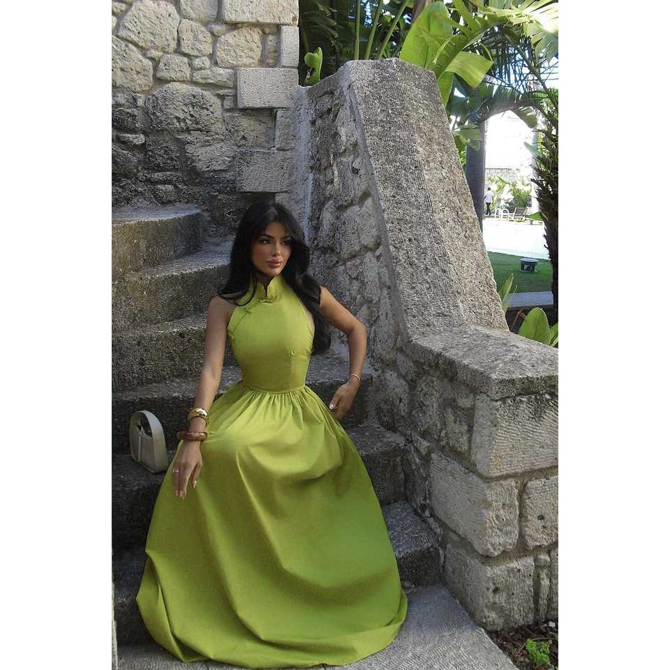 ชุดราตรียาวถักโครเชต์สีเขียวมะกอกของ Tania ดีไซน์หรูหราสไตล์งานเลี้ยง เอวทรงเอ็มไพร์ เหมาะสำหรับโอกาสพิเศษ งานแต่งงาน งานเลี้ยงตอนเย็น ไซส์ XL