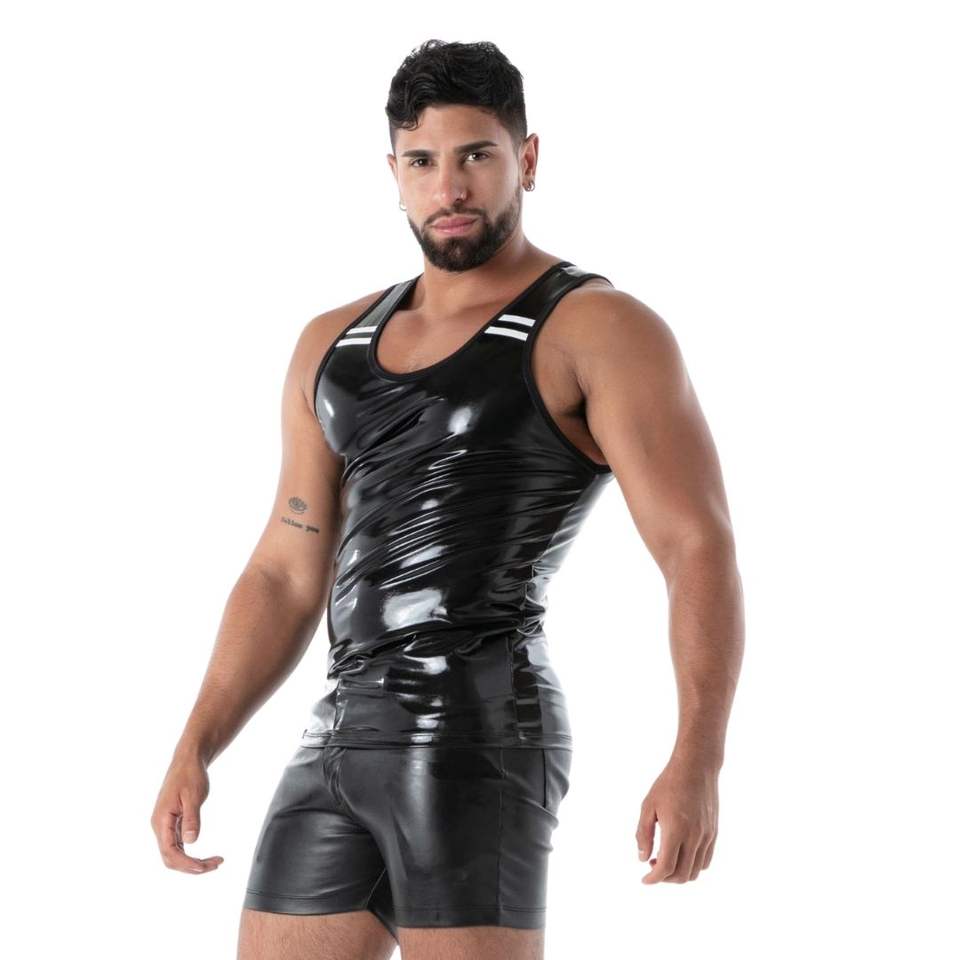 เสื้อกล้ามหนังสีดำทรงเข้ารูปสำหรับผู้ชาย สไตล์ทางการ เป็นมิตรกับสิ่งแวดล้อม เหมาะสำหรับงานปาร์ตี้ คลับแวร์ แฟชั่นทันสมัย
