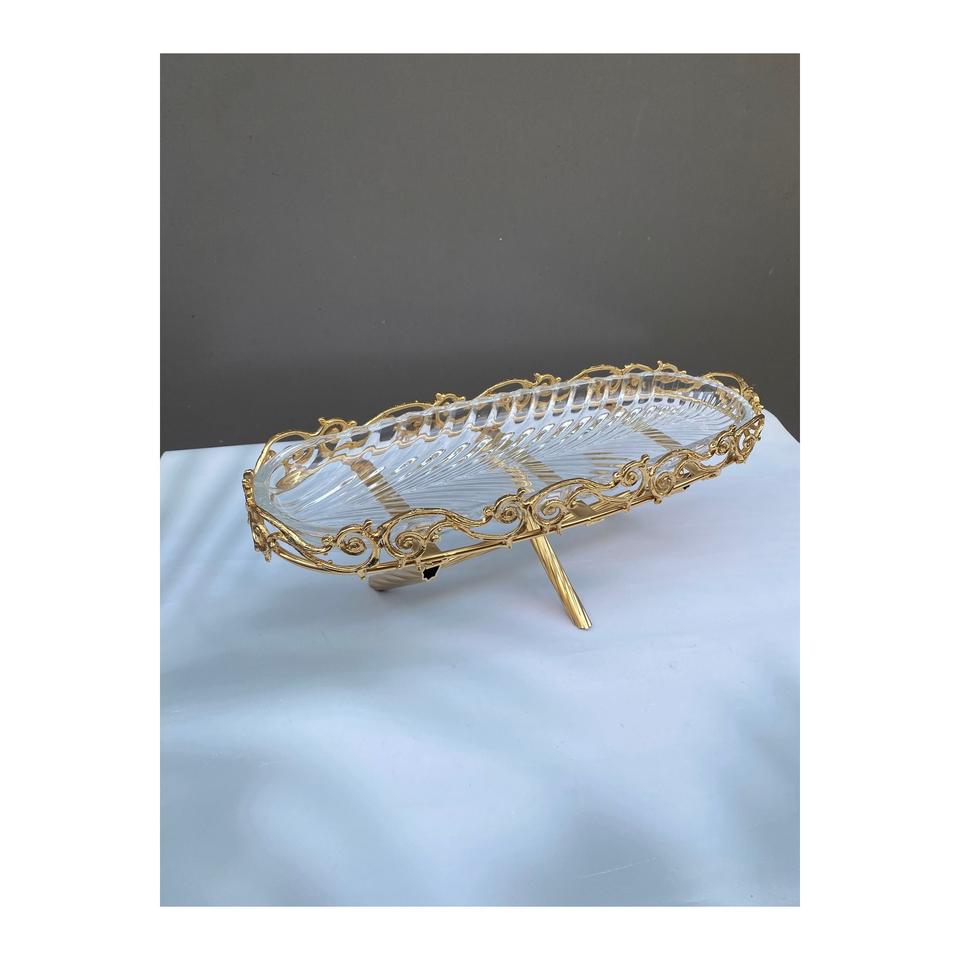 ถาดเสิร์ฟทรงรีแบบคลาสสิก ทาซาริม ชั้นเดียว สีทอง พร้อมฝาแก้วใส ขนาด 40.5 ซม.