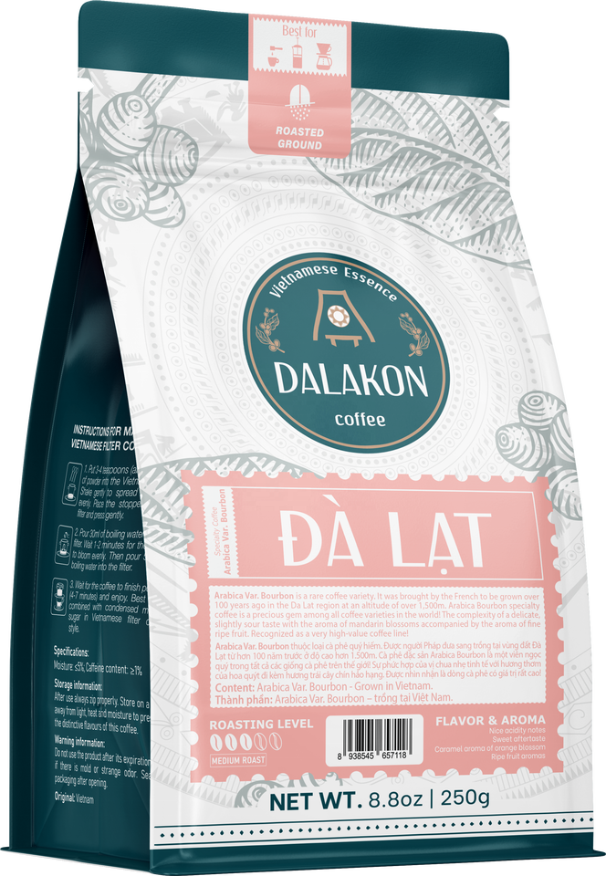 กาแฟคั่วบดอาราบิก้า บูร์บง ดาลาคอง ดาลัต รสเปรี้ยว คั่วระดับกลาง ตราเทสตี้ดริงค์ส บรรจุถุงพรีเมียม ขายส่ง มีคาเฟอีน ช่วยเพิ่มความชุ่มชื้น