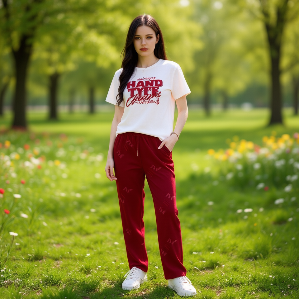 Tc402 เสื้อยืดแขนสั้นผู้หญิงแบบลำลอง 2 ชิ้น ชุดเสื้อยืดถักพิมพ์ลายตัวอักษร กางเกงขายาวทรงหลวม ฤดูใบไม้ผลิฤดูร้อน