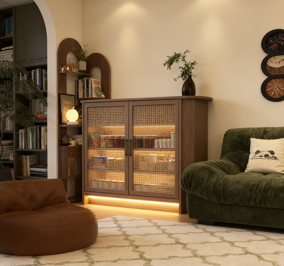 ตู้หนังสืออเนกประสงค์ Teak & Ivory - พร้อมไฟ LED ตกแต่งและตู้กระจก, ใช้เป็นชั้นวางหนังสือ+ตู้เก็บของ+ของตกแต่งสำหรับบ้านสมัยใหม่