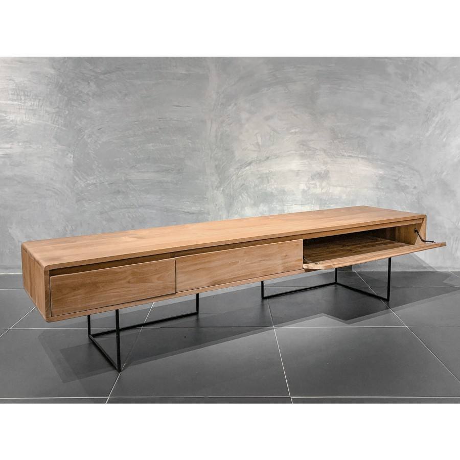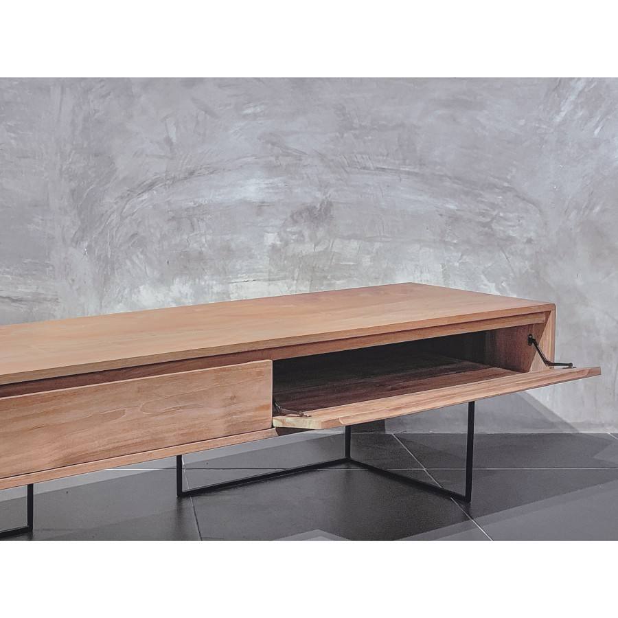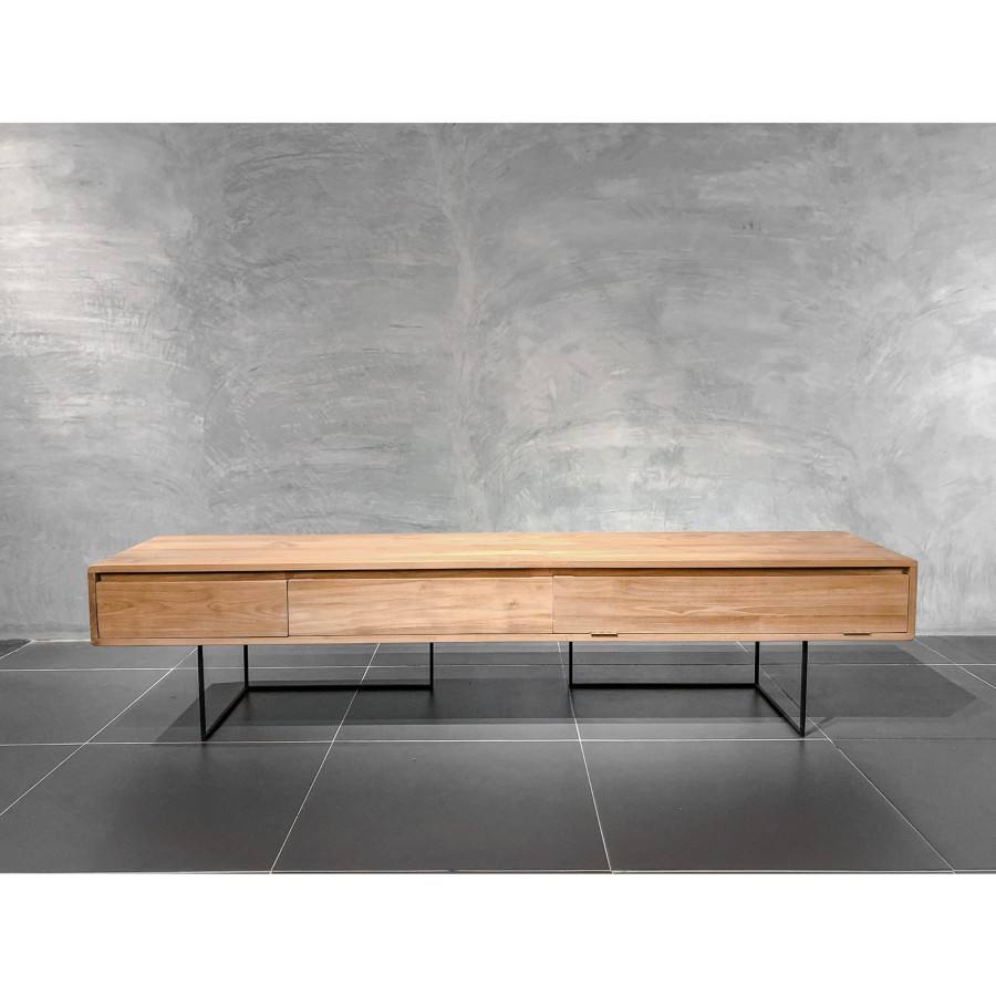 ตู้วางทีวีไม้สักสีธรรมชาติ ตู้วางมีเดียทันสมัย ฐานเคลือบผงเหล็ก ดีไซน์เรียบหรูสำหรับห้องนั่งเล่น เฟอร์นิเจอร์เตี้ยสำหรับจัดเก็บของในบ้าน