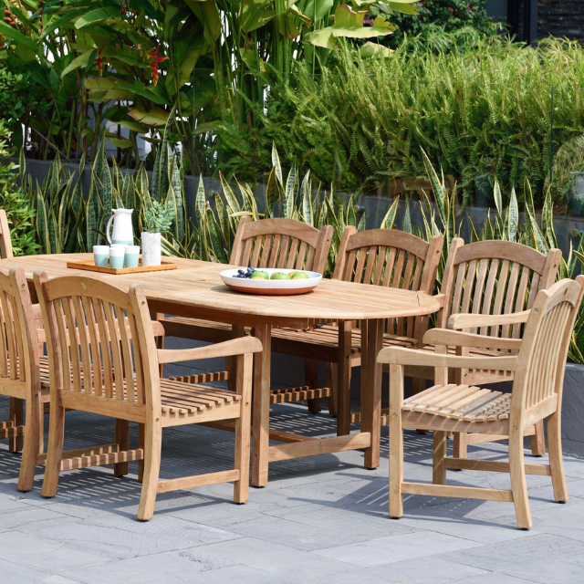 ชุดรับประทานอาหารไม้สักกลางแจ้งที่ทนทานทันสมัยพร้อมโต๊ะยืดรูปไข่และเก้าอี้เท้าแขนด้านหลังโค้งแบบคลาสสิกสำหรับใช้ในโรงแรม
