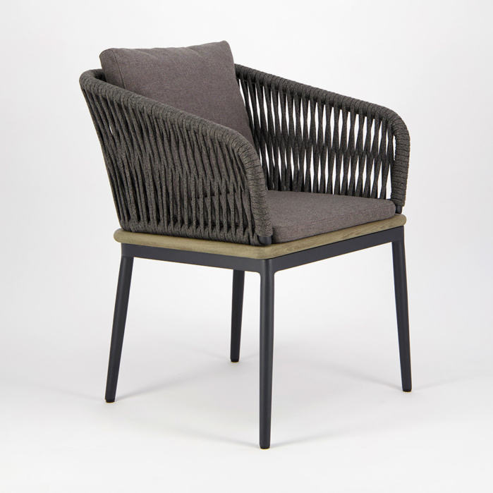 เก้าอี้ทานอาหารมีที่พักแขน ทำจากอลูมิเนียมเคลือบสีฝุ่นและเชือก ลายไม้สัก สำหรับใช้งานภายนอก - Brianna