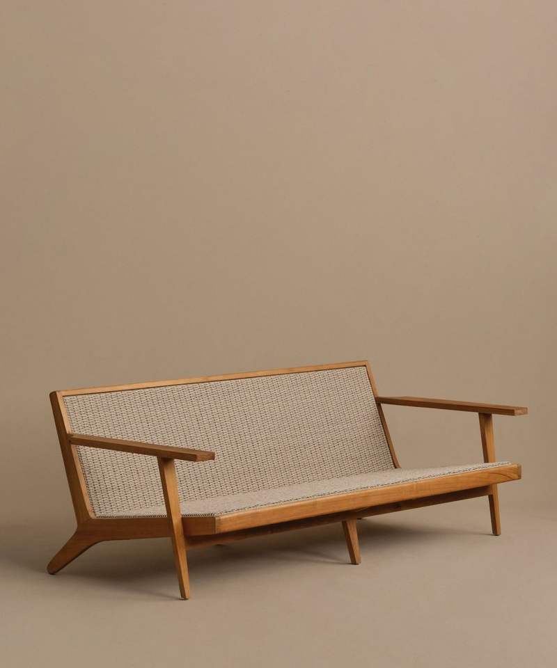 โซฟาไม้สักพร้อมพนักพิงหวายสานมือและที่วางแขนดีไซน์เรียบง่ายเพื่อพื้นที่ใช้สอยที่อบอุ่นและเป็นธรรมชาติ