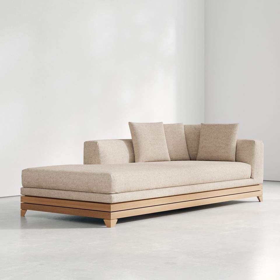 โซฟาเดย์เบดไม้สักพร้อมฐานไม้เนื้อแข็งแบบเตี้ยและเบาะหุ้มผ้าคุณภาพพรีเมียมเพื่อความหรูหราสไตล์ทรอปิคอล