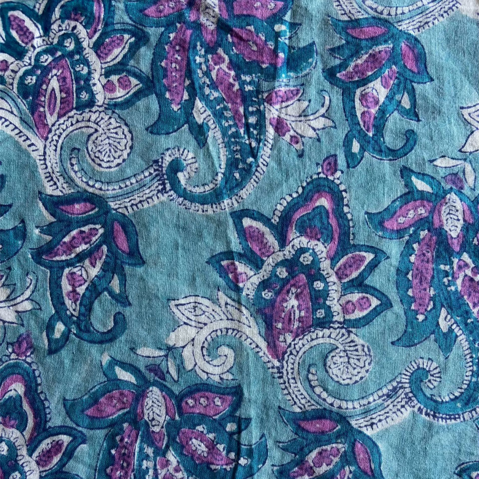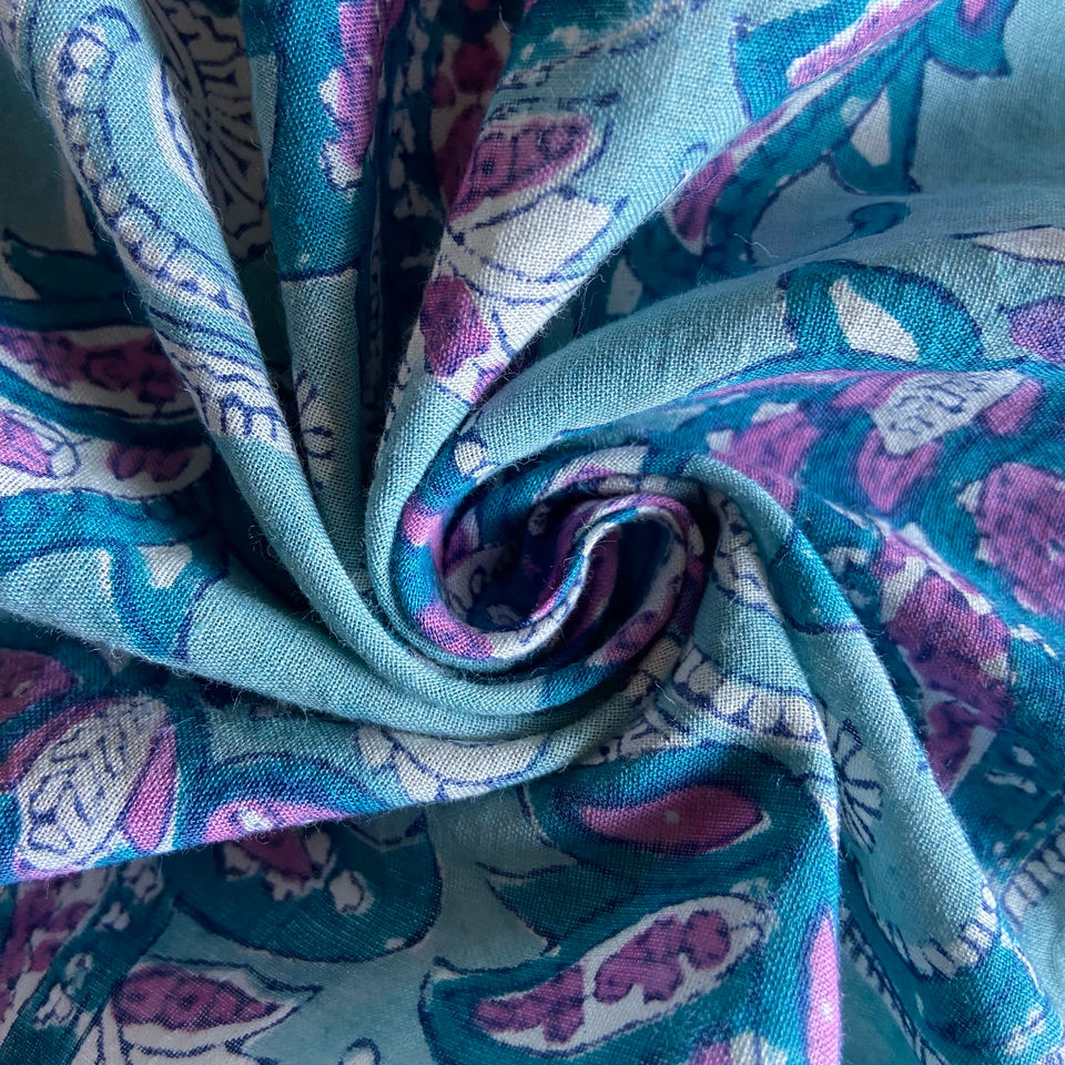 ผ้าฝ้ายพิมพ์ลายมือลายเพสลีย์สีฟ้าอมเขียว ดีไซน์คลาสสิกแบบอินโด-ยุโรป โบฮีเมียน