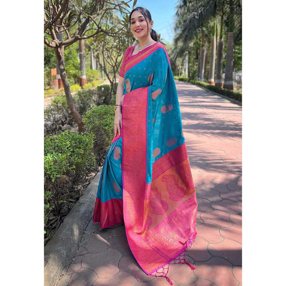 ผ้าไหมสีเขียวอมฟ้า ELITE WEAVES พร้อมลายปักดิ้นทอง ยืดหยุ่น แห้งเร็ว ป้องกันแสงแดด ดีไซน์หรูหราสำหรับผู้หญิง
