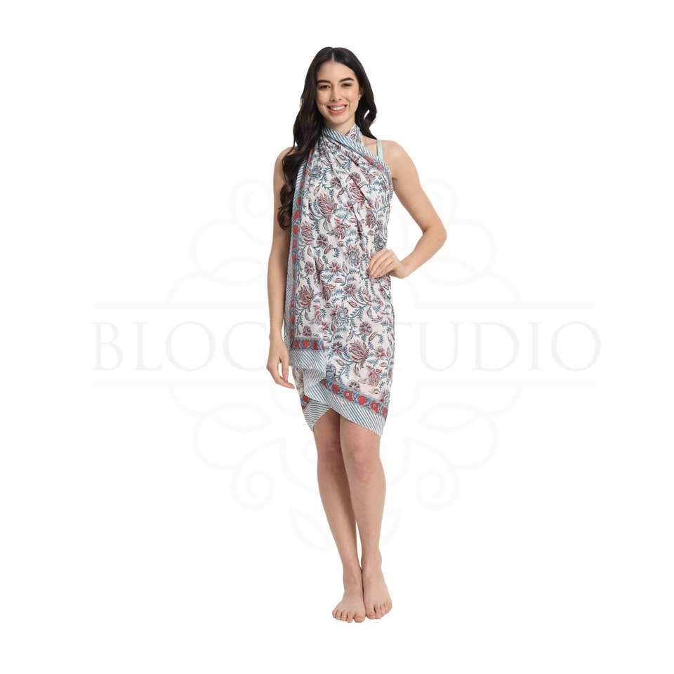 ผ้าซิ่นพิมพ์ลายมือสีเขียวอมฟ้าและสีแดงไหม้สำหรับผู้หญิง ผ้าคลุมบิกินี่น้ำหนักเบา เหมาะสำหรับใส่ไปชายหาดและรีสอร์ทในฤดูร้อน