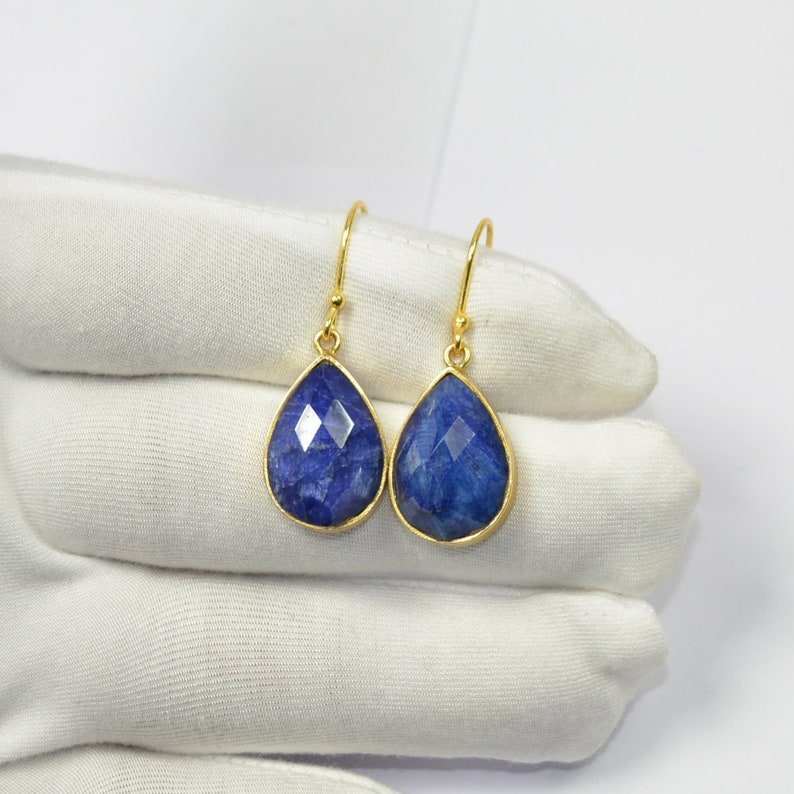หยดน้ำตาพลอยแซฟไฟร์สีน้ำเงินและต่างหูห้อยเงินแท้925,ต่างหูชุบทอง18K สำหรับผู้ซื้อขายส่ง