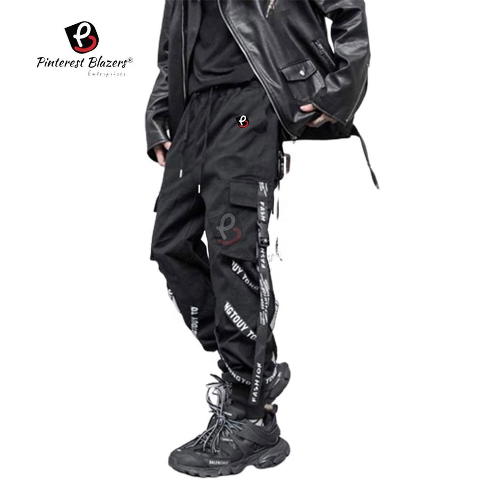 กางเกงผู้ชายติดริบบิ้นสีดำสไตล์สตรีทแวร์สไตล์ลำลองมีริบบิ้นสำหรับผู้ชายกางเกงเทคผลิตขึ้นสำหรับสหรัฐอเมริกา