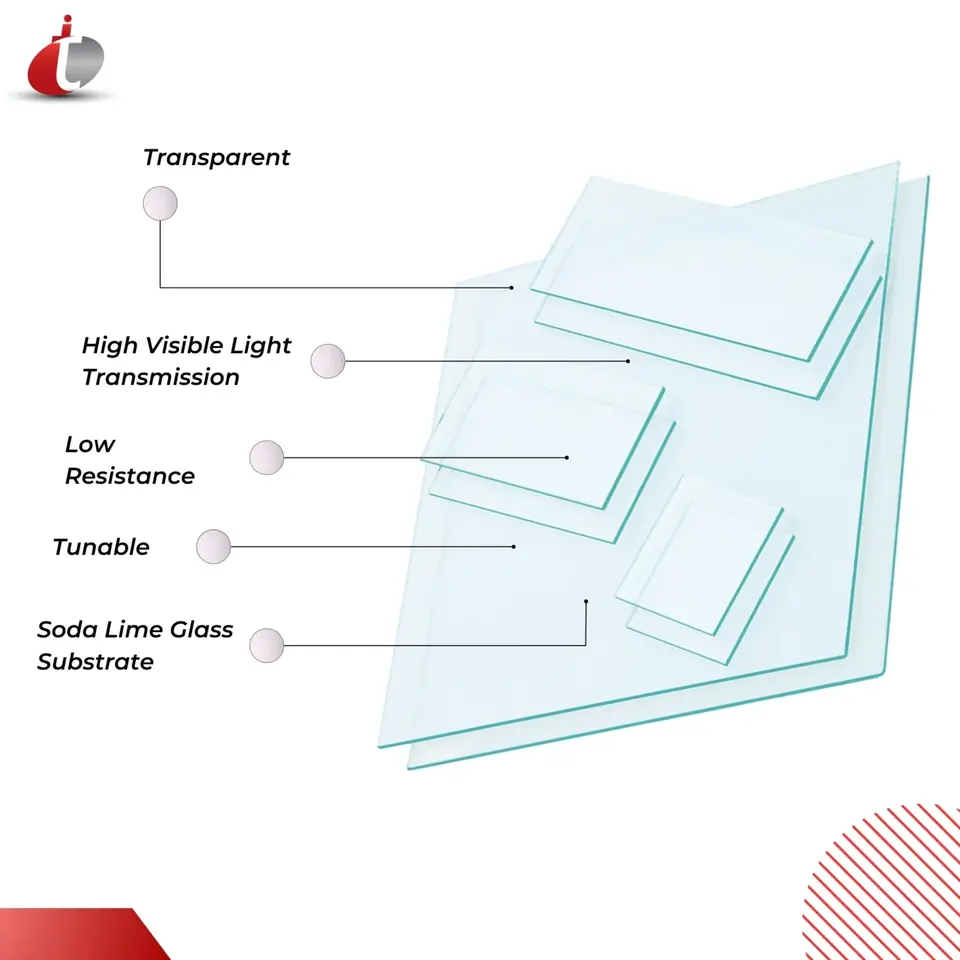 กระจกใสเคลือบ ITO ของเทคินสโตร ความต้านทาน 20 โอห์ม/ตร.ม. ค่าการส่งผ่านแสงมากกว่า 83% ขนาด 50x50 มม. ความหนา 1.1 มม. สำหรับการป้องกันในห้องปฏิบัติการ
