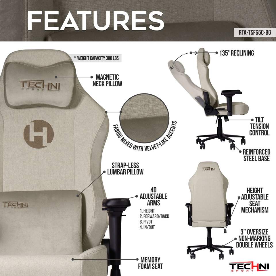 เก้าอี้เล่นเกมเมมโมรีโฟมสีเบจ TSF65C แนวสปอร์ตเทคนี่