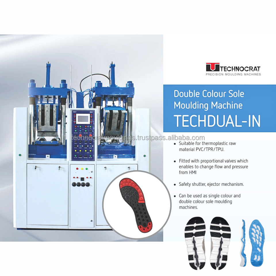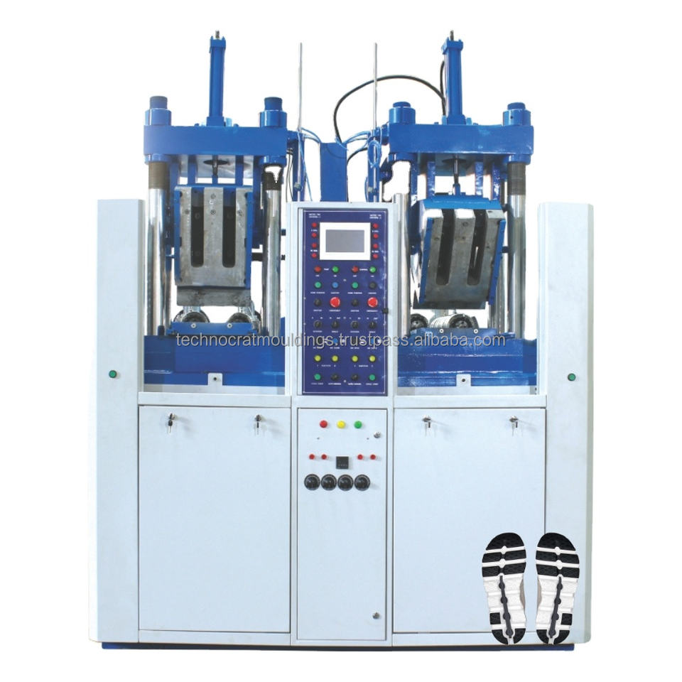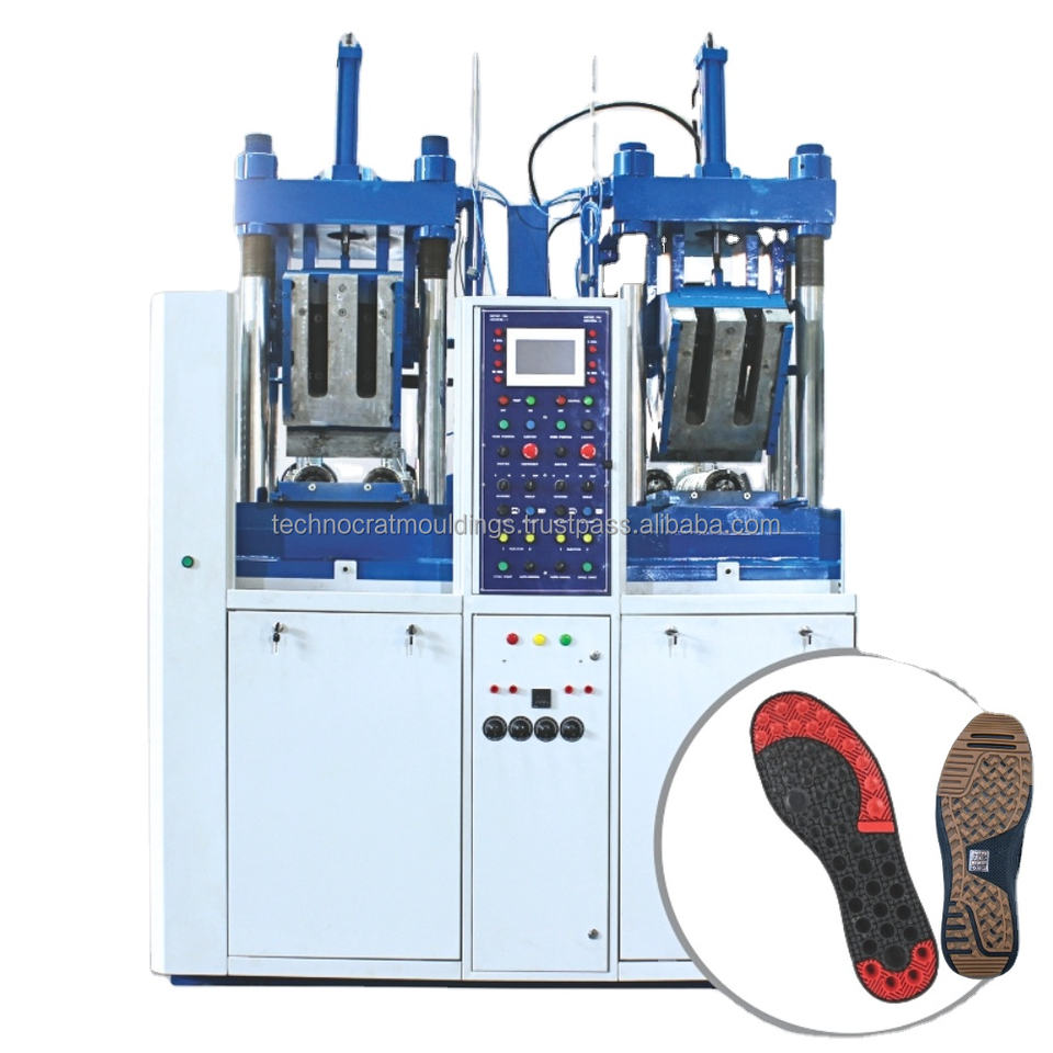 เครื่องขึ้นรูปพื้นรองเท้า TPR PVC ยี่ห้อ Technocrat Mouldings ควบคุมด้วย PLC เป็นมิตรกับสิ่งแวดล้อม มอเตอร์ประสิทธิภาพสูง ชิ้นส่วนหลัก ความจุ 140 รองเท้า