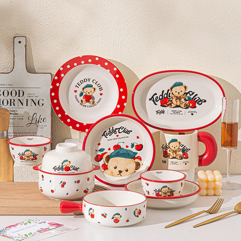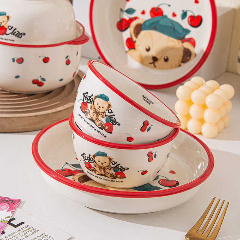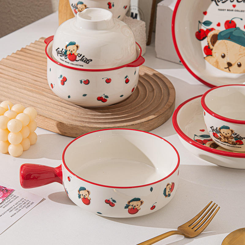 ชุดชามเซรามิคเท็ดดี้คลับพร้อมฝาปิดลายเชอร์รี่ 450 มล. สำหรับซุป บะหมี่ ใช้ในบ้าน ของขวัญ