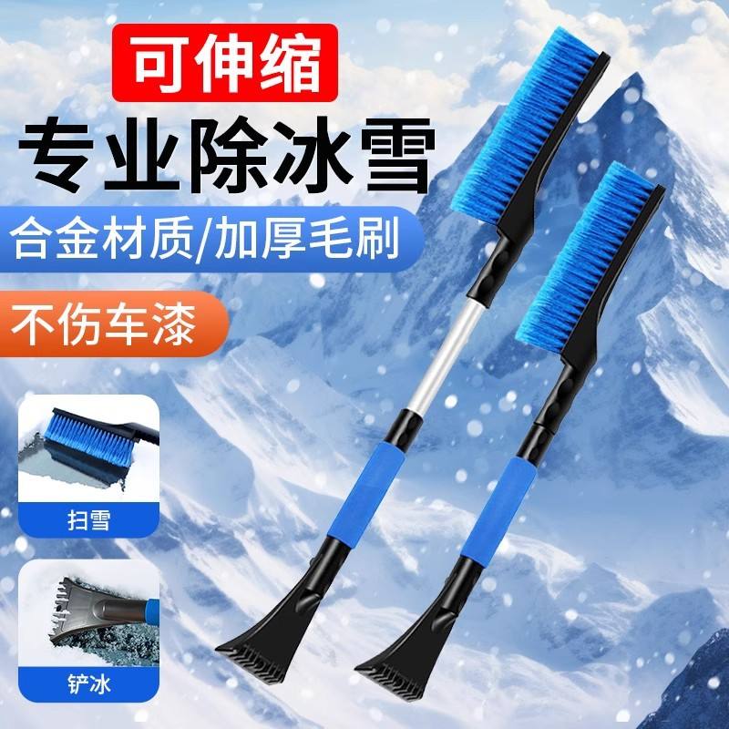 แปรงปัดหิมะแบบยืดหดได้ วัสดุโลหะผสม ขนแปรงหนา ที่ขูดน้ำแข็งในรถยนต์ อุปกรณ์กำจัดหิมะในฤดูหนาว สีฟ้า