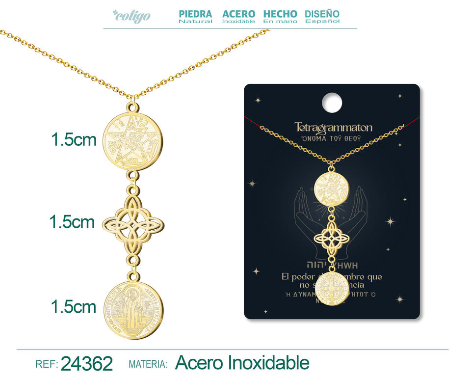 Tetragramton Gold Stainless Steel Link Pendant Necklace Witch's Knot Saint Benedict Lucky Protection Amulet Minimalist Design