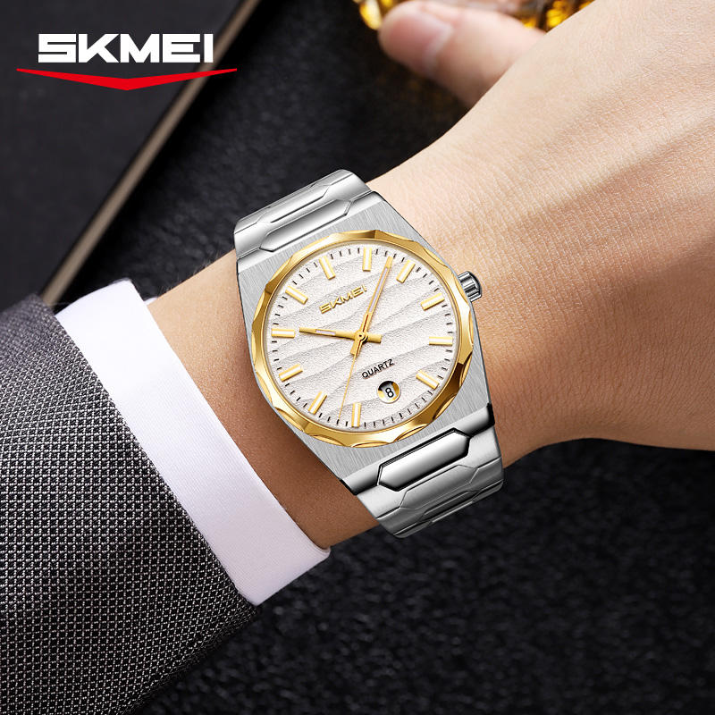 นาฬิกาข้อมือผู้ชาย ดีไซน์เรียบหรู ตัวเรือนโลหะผสม หน้าปัดมีลวดลาย สีทอง สายสแตนเลส กันน้ำ 3ATM ระบบควอตซ์ รับสลักโลโก้