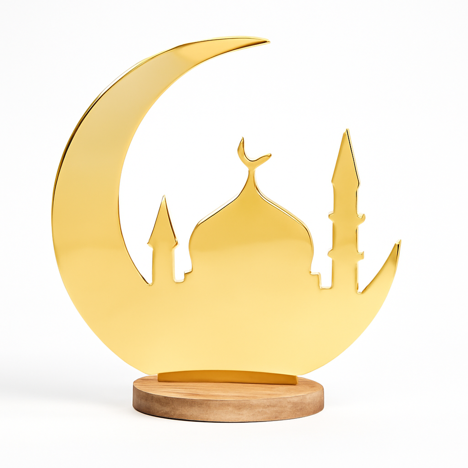 พื้นผิวสีทองพระจันทร์เสี้ยวตกแต่งมัสยิดอิสลามอีสต์รอมฎอนโต๊ะโชว์ชิ้นจิตวิญญาณของตกแต่งบ้านฐานไม้
