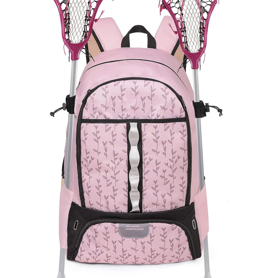 กระเป๋าใส่อุปกรณ์ลาครอสสีแดงแบบมีพื้นผิว พร้อมระบบยึดหมวกด้านหน้าและช่องใส่ไม้คู่ด้านข้างสำหรับการเล่นแบบแข่งขัน