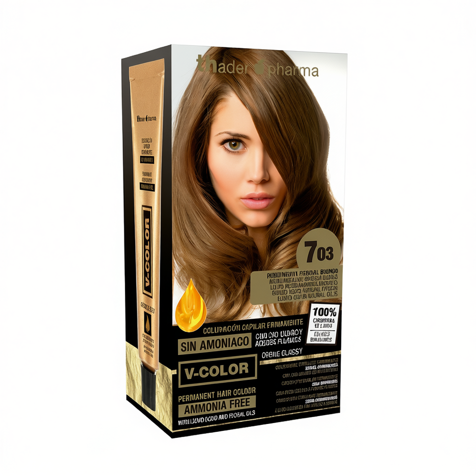 ยาสีย้อมผมถาวรออร์แกนิค ปลอดสารพิษ เธเดอร์ ฟาร์มา วี-คัลเลอร์ 703 สีบลอนด์กลาง สีทองธรรมชาติ ปราศจากแอมโมเนีย 15 มล. ชนิดน้ำ สีทองลายดอกไม้