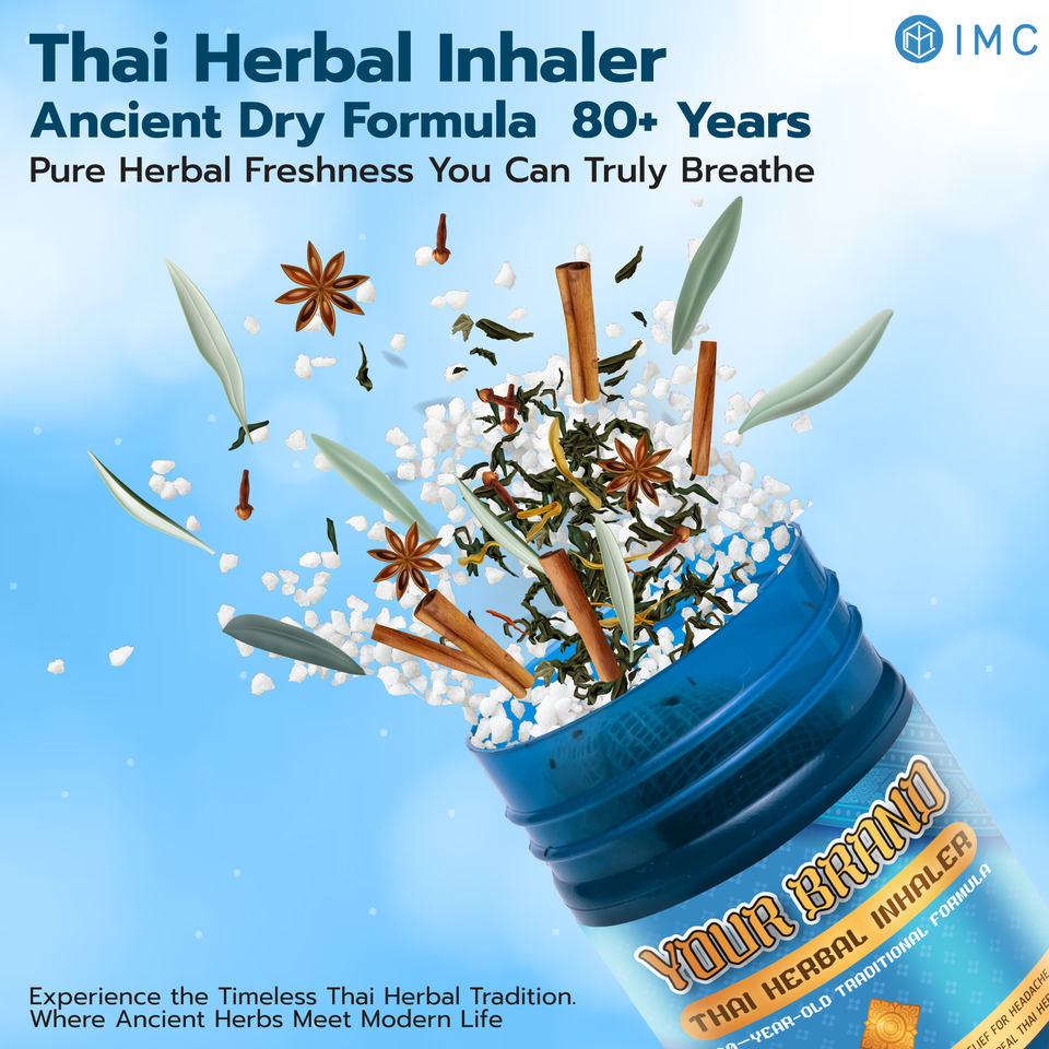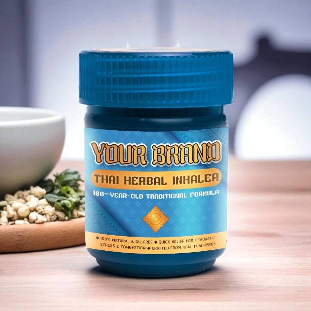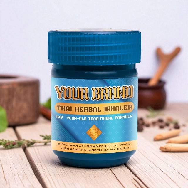 ยาหม่องสมุนไพรไทยสำหรับสูดดม ผสมเมนทอลและตะไคร้หอม บรรจุในภาชนะพลาสติก สำหรับใช้เพื่อความสดชื่นทุกวัน