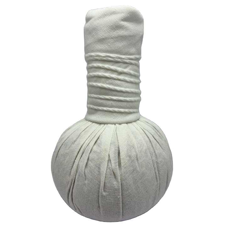 ลูกบอลสมุนไพรให้ความร้อนจนกระทั่งอุ่นและกดบนจุดที่เจ็บ